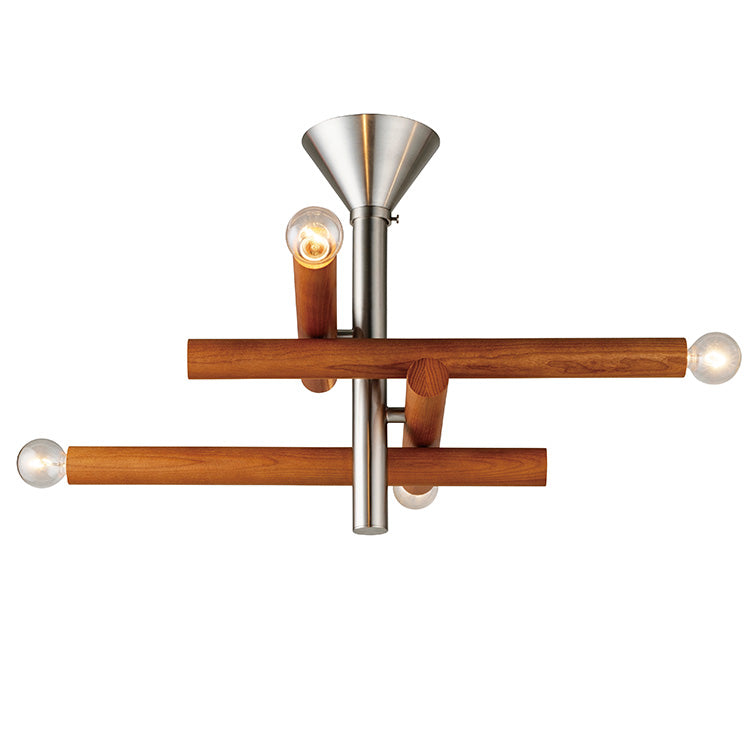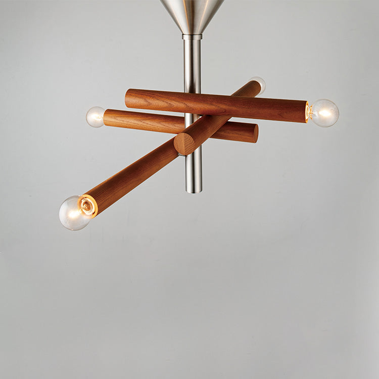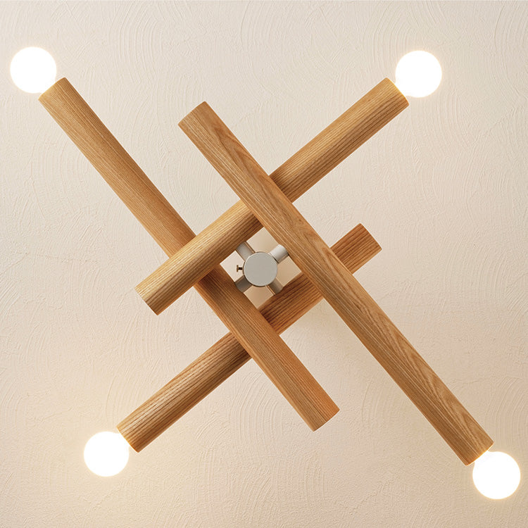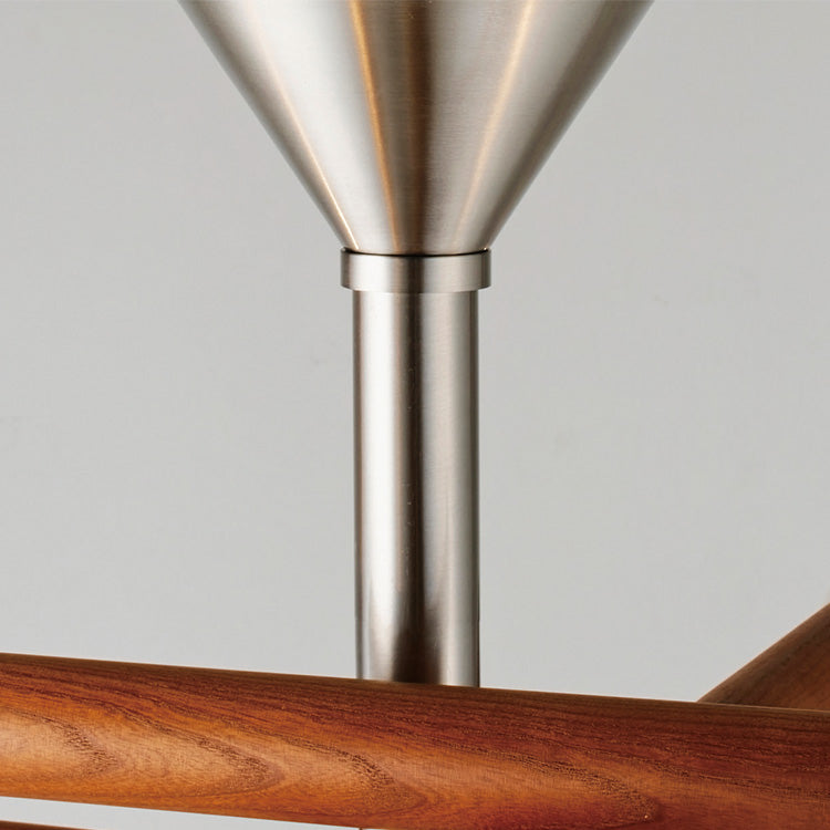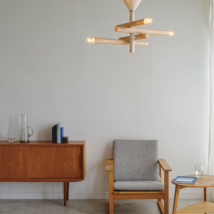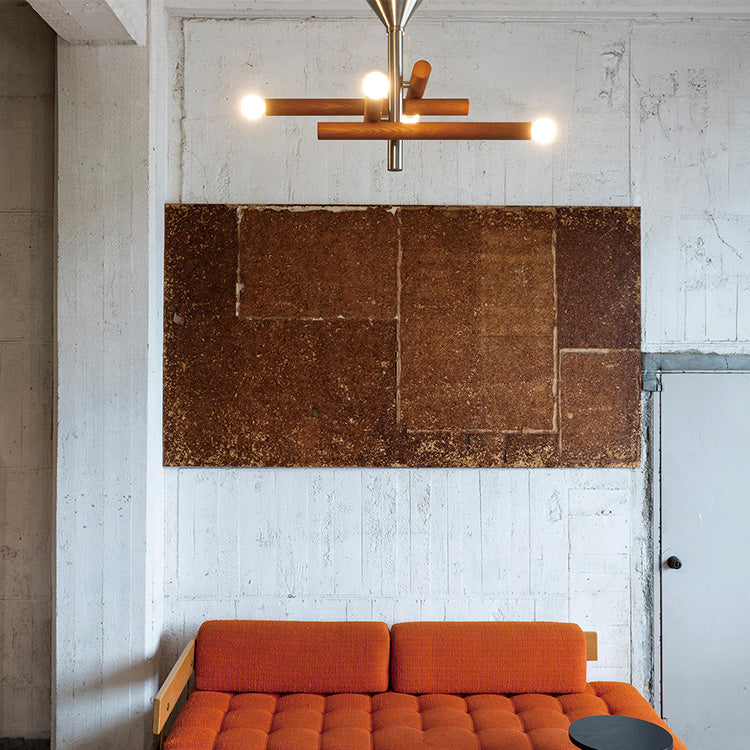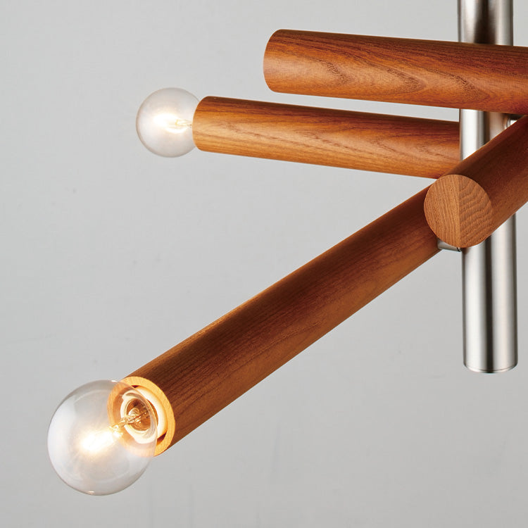 交差しあう直線が作る豊かな奥行きと確かな存在感。立体的に配置された木柱が木組み建築を想起させるアーキテクチュアルなデザイン。一見不規則ながらも計算し尽くされたプロポーションは角度によって、そのシルエットを大きく変化させます。あたたかみを感じさせる木を贅沢に使用し、空間との調和を図りました。