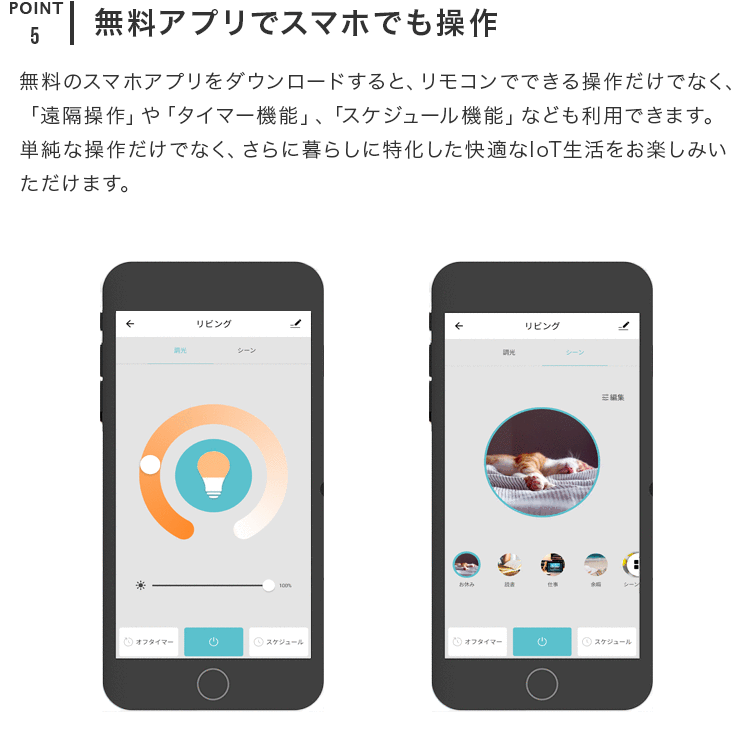 無料の専用スマホアプリをダウンロードすればON/OFFはもちろん、調光・調色機能までお手持ちのスマホでの操作が可能。