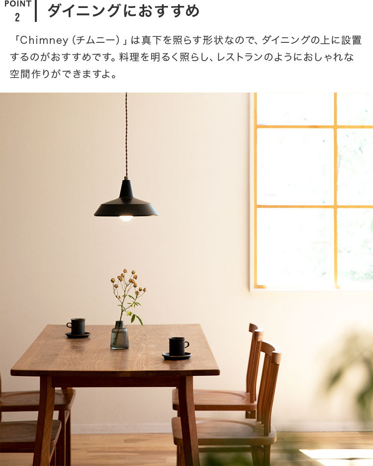 「Chimney(チムニー)」は真下を照らす形状なので、ダイニングの上に設置するのがおすすめです。料理を明るく照らし、レストランのようにおしゃれな空間作りができますよ。