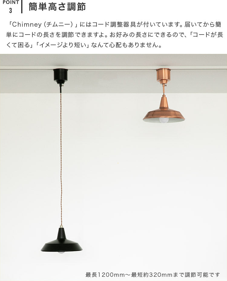 「Chimney(チムニー)」にはコード調整器具が付いています。届いてから簡単にコードの長さを調節できますよ。お好みの長さにできるので、「コードが長くて困る」「イメージより短い」なんて心配もありません。