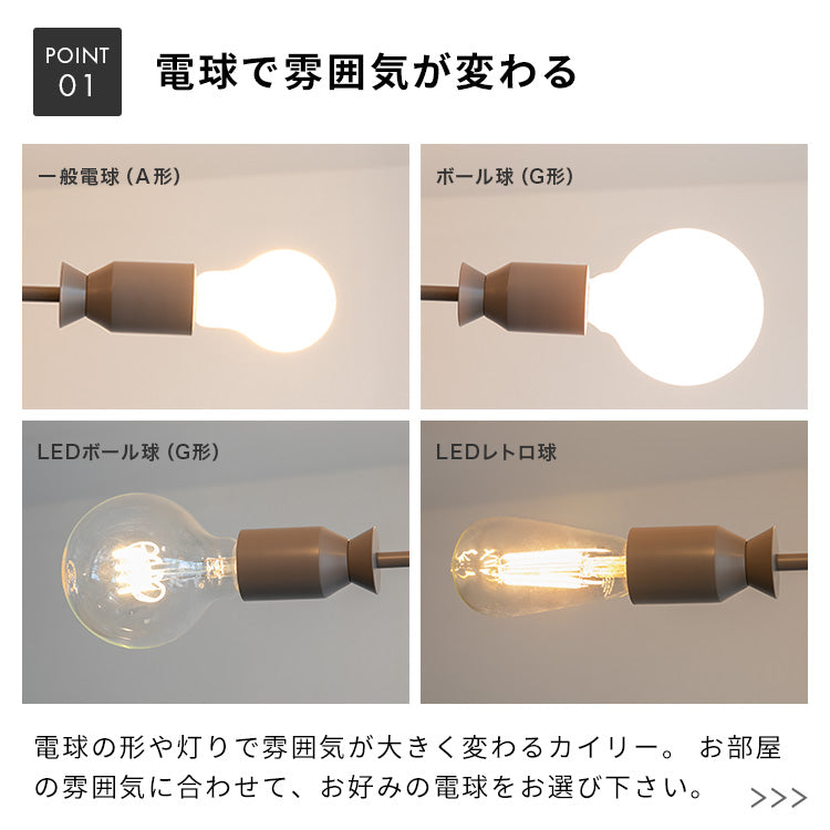 電球の形や灯りで雰囲気が大きく変わるカイリー。 お部屋の雰囲気に合わせて、お好みの電球をお選びください。