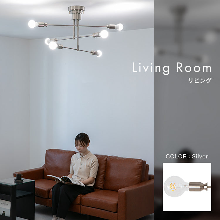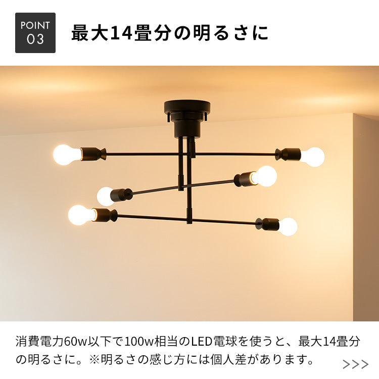 消費電力60W以下で100W相当のLED電球を6球使用すると、最大14畳分の明るさに。取り付ける場所によって最適の電球を選びましょう。 (明かりの感じ方には個人差がございます。)
