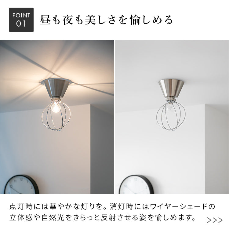 点灯時には華やかな灯りを。消灯時にはワイヤーシェードの立体感や自然光をきらっと反射させ、昼も夜も美しい佇まいを愉しめます。