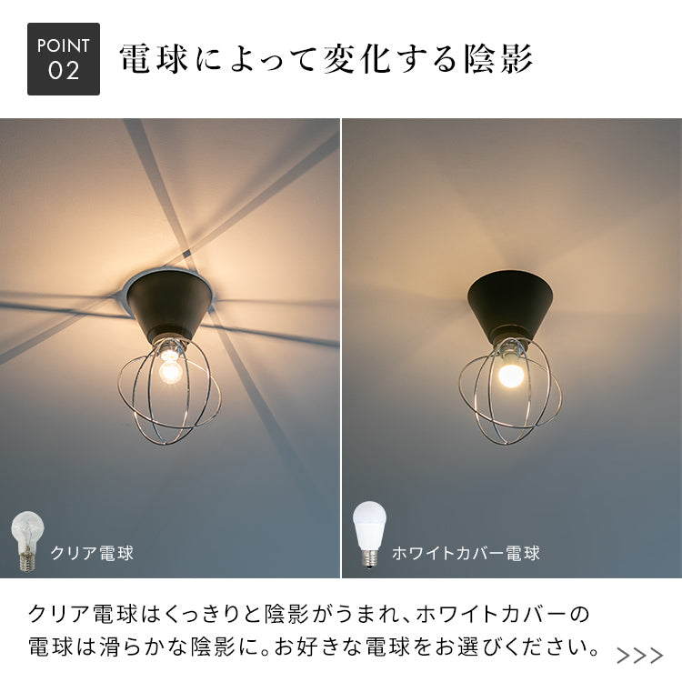 クリア電球はくっきりと陰影がうまれ、ホワイトカバーの電球は滑らかな陰影に。お好きな電球をお選びください。