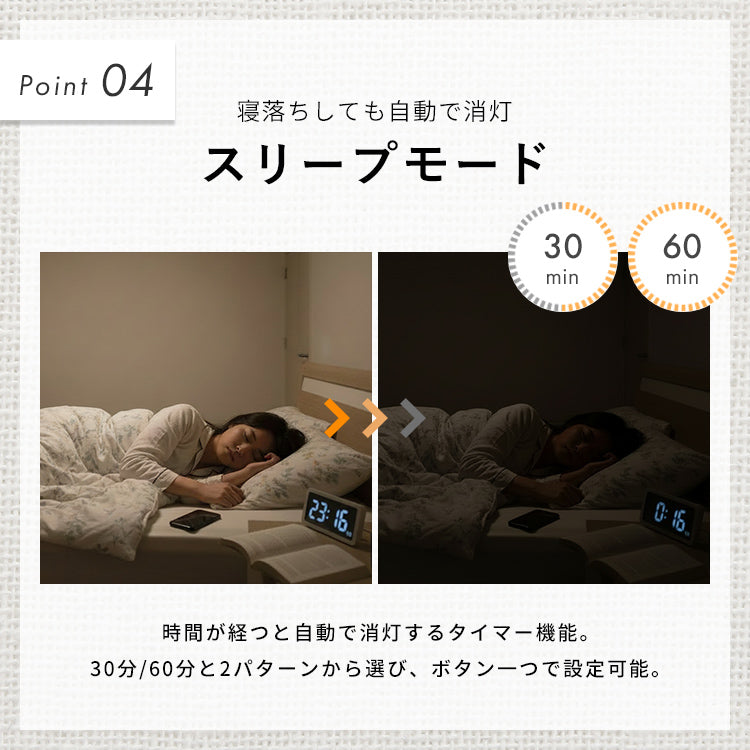 時間が経つと自動で消灯するタイマー機能。30分/60分と2パターンから選び、ボタン一つで設定可能。
