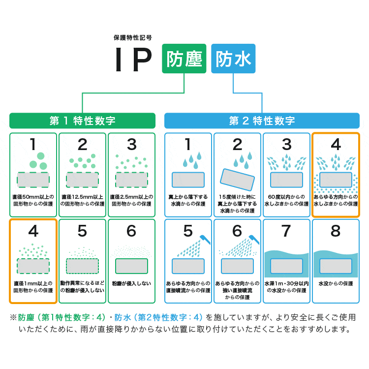 適用規格:JISC0920:2003 電気機械器具の外郭による保護等級