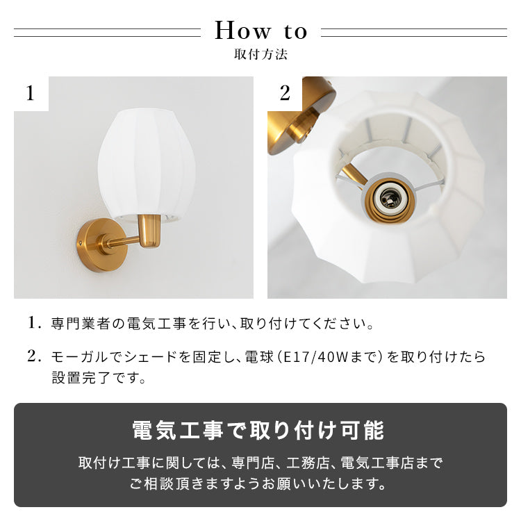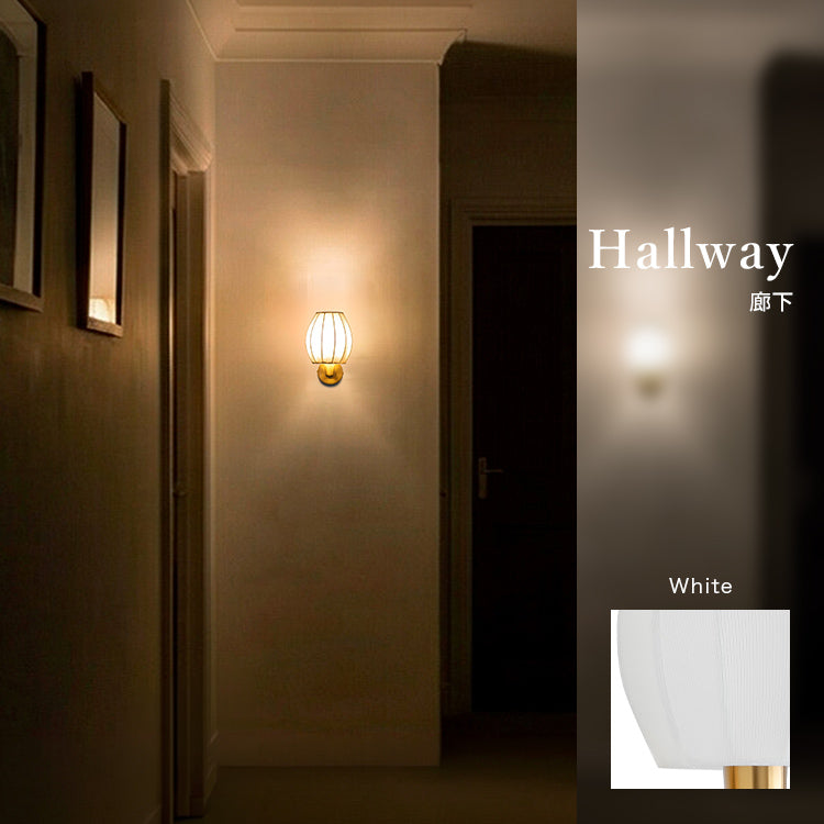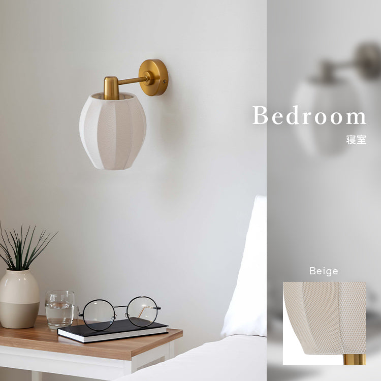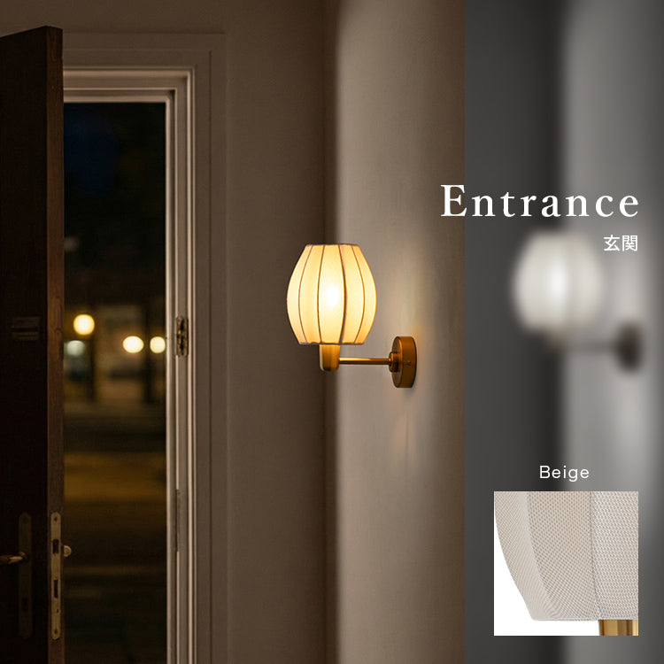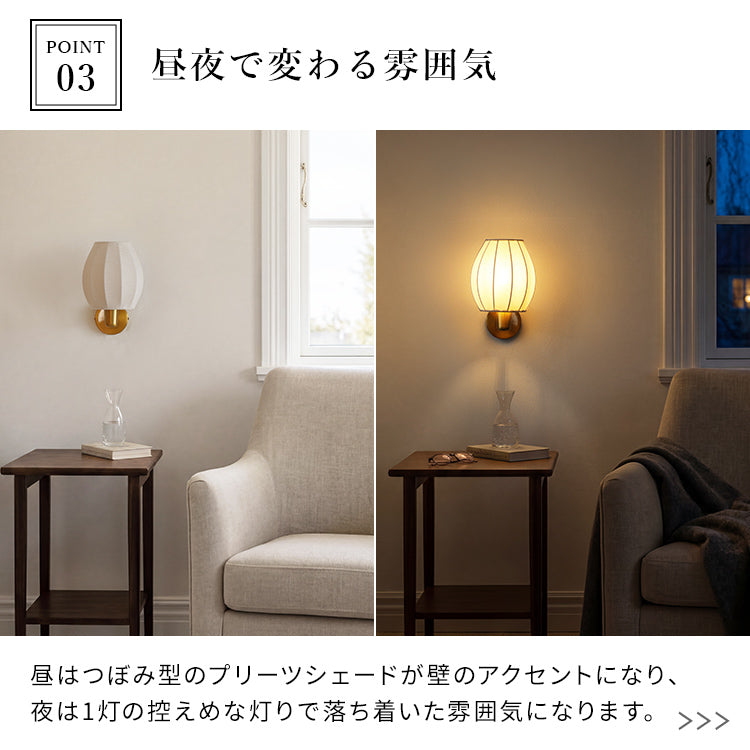 昼間は消灯していても、つぼみ型のプリーツシェードが壁のアクセントになり、空間に静かな可愛さを添えてくれる存在。夜は1灯の控えめな灯りで部屋を照らしすぎず、壁灯ならではの光の景色が生まれ、いつもの部屋が少しだけ特別に変わります。