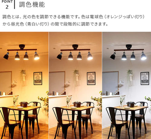 調色とは、光の色を調節できる機能です。色は電球色(オレンジっぽい灯り)から昼光色(青白い灯り)の間で段階的に調節できます