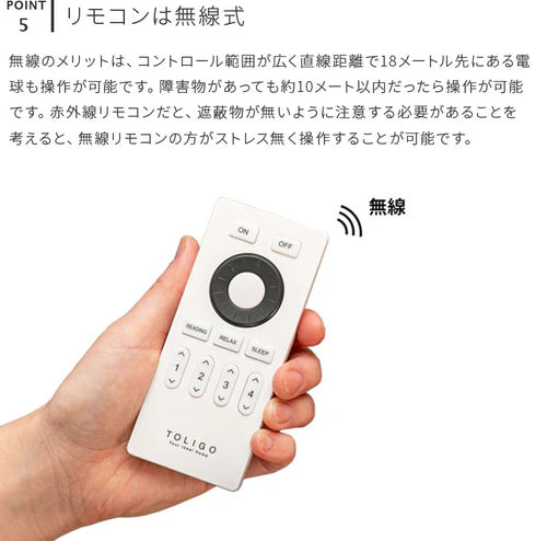 無線のメリットは、コントロール範囲が広く直線距離で18メートル先にある電球も操作が可能です。障害物があっても約10メート以内だったら操作が可能です。赤外線リモコンだと、遮蔽物が無いように注意する必要があることを考えると、無線リモコンの方がストレス無く操作することが可能です。